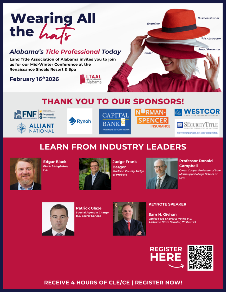 The Land Title Association of Alabama (LTAAL) is an organization formed by and for the benefit of Alabama title agents, abstractors and other title professionals. We seek to connect our members by providing ongoing education and training which will promote exceptional title and abstract services. LTAAL will provide our members a pro-active voice in the State and Federal legislative process as well as provide employment opportunities for future professionals in our industry.